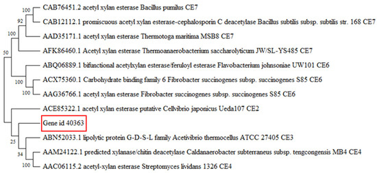 Phylogenetic tree. The nucleotide sequence of Gene_id_40363 was used to construct a phylogenetic tree with characterised proteins of CE family 1–7 with 3D models available in PDB. A Neighbour-Joining phylogenetic tree was constructed in MEGAX with 1000 bootstrap replicates. Proteins are identified with their GenBank number and described with their function(s) and CAZy classification.
