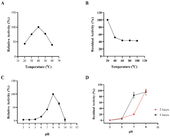 Biochemical properties. The biochemical properties of BaAXE were determined in assays with 4-NPA. (A) The optimal temperature was determined in assays performed at different temperatures: 20 °C, 30 °C, 40 °C, 50 °C, and 60 °C. (B) Thermostability assay determined after incubating the enzyme for 2 h at different temperatures. (C) The optimal pH was determined in assays performed at different pHs at the optimal temperature. (D) pH stability was determined after incubation of the enzyme for 4 h at 20 °C. After 2 h of incubation, residual activity was determined, and after 4 h, the residual activity was determined. Absorbance readings were measured at 410 nm. Assay without the enzyme was used as blank. Assays were performed in triplicate, and error bars correspond to SEM.