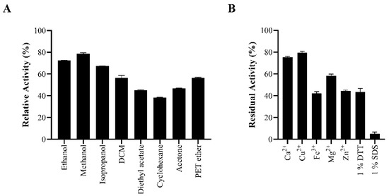 Inhibition by organic solvents and additives. The enzyme was assayed in the presence of (A) 20% selected organic solvent and (B) 1 mM metal ion, 1% DTT, and 1% SDS. Reactions proceeded for 10 min, and absorbance reading was measured at 410 nm. Assays were performed in triplicate, and error bars correspond to SEM. Relative activity was determined relative to a control reaction lacking any additive or organic solvent. DCM—dichloromethane, PET—petroleum ether.