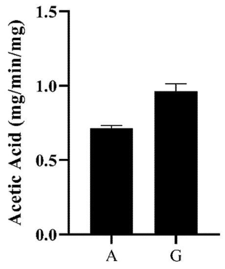 Acetic acid release. The activity of the enzyme on acetylated monosaccharides and xylooligosaccharides was determined by the hydrolytic release of acetic acid from these substrates. Acetic acid release was measured with GC–MS after incubating the enzyme with birchwood xylan (partially acetylated) (A) and β-d-glucosepentaacetate (G). The acetic acid release was estimated from an acetic acid standard plot.