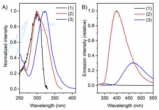 To summarise, we observed a desired red shift of the excitation, from a narrow distribution with a peak at 299 nm for (1), going to a broader distribution with the same peak wavelength of 299 nm for (2), and finally going to a broad distribution with a peak at 321 nm for (3) (Figure 4A; Table 1), featuring a signal even in the range of 380–400.