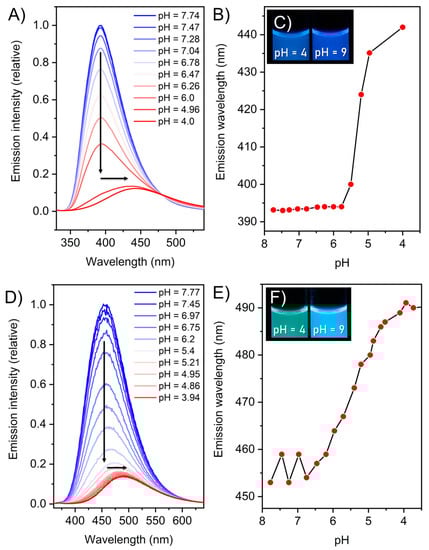 (A) Emission spectra of (2) at different pH values, blue = high pH, red = low pH. (B) Emission maximum of (2) plotted against the pH value. (C) Photograph of compound (2) at pH = 4 and pH = 9 under UV-irradiation (λex = 365 nm) (100 µM, bis-tris buffer 6 mM). (D) Emission spectra of (3) at different pH values, blue = high pH, red = low pH. (E) Emission maximum of (3) plotted against the pH value. (F) Photograph of compound (3) at pH = 4 and pH = 9 under UV-irradiation (λex = 365 nm) (100 µM, bis-tris buffer 6 mM).
