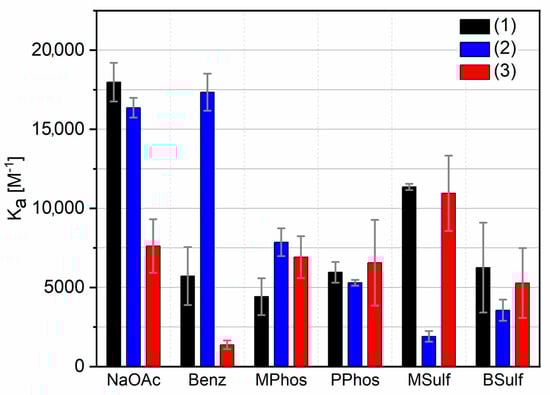 UV/Vis titrations were performed in bis-tris buffer solution at pH = 6, which, considering the pKa values, leads to a widespread protonation of the compounds while staying within a neutral range. (For detailed experimental procedure see Chapter 4, ESI.) Only evaluation of 1:1 complexes with the Job’s method delivered suitable values corroborating the formation of complexes with this stoichiometry. Association constants and standard deviations are depicted in Table 2 and Figure 8 (calculation performed with www.supramolecular.org (accessed on 25 May 2021) [41,42]). In this regard, it is important to note that the range of all association constants is between Kass ≈ 1000–18,000 M−1, which means that (2) and (3) show binding affinity to oxo-anions in a similar range to GCP, which is considered to be high in competitive media, such as water or even buffer [43]. The higher associations constants for (1) measured in this study compared to previous work (Kass ≈ 18,000 M−1 for acetate vs. Kass ≈ 2800 M−1) [22] can be easily explained with the measurement conditions. We used a buffer with a defined pH value of 6 in this work, compared to a DMSO/water mixture in the previous work, which should have a pH above 7, due to the low acidity of DMSO. The lower pH value leads to a higher protonation of the guanidinium group and therefore to higher association constants. A certain pH-dependence in oxo-anion recognition of ammonium containing receptors was observed before [44]. Additionally, the addition of a buffer agent can have an influence on the association constant [45]. The comparable values for (2) and (3) illustrate that these moieties can be used as substitutes in applications in which (1) was used previously, even in challenging biological applications, where buffered solutions are needed. Nevertheless, there are some trends which can be observed, which will be discussed vide infra.