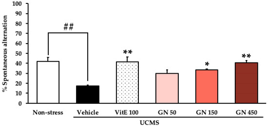 When assessed in the Y-maze test, the vehicle-treated UCMS mice showed significantly less percentage of spontaneous alternation than the non-stress group, indicating an impairment of a spatial memory or a short-term memory caused by UCMS. Treatment with GN bark resin extract with two different doses, i.e., 150 and 450 mg/kg/day, and with vitamin E (100 mg/kg/day) significantly increased the percentage of spontaneous alternation compared to the vehicle-treated UCMS group (Figure 2). For detailed statistical analysis, see Table S11.