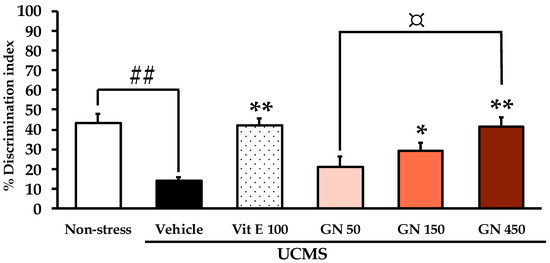 For the NORT, during the sample phase trial, all groups spent equal time exploring the two identical objects (for detailed statistical analysis, see Table S12). During the test phase trial of NORT, the non-stress mice could successfully discriminate between the new and the familiar object, while the vehicle-treated UCMS mice failed to recognize the new object. In contrast, the UCMS mice treated with vitamin E (100 mg/kg/day) and GN bark resin extract (150 and 450 mg/kg/day) were significantly ameliorated in the discrimination index performance. A dose-dependent manner of the GN bark resin extract, from 50 to 450 mg/kg/day, was observed in the NORT (Figure 3).