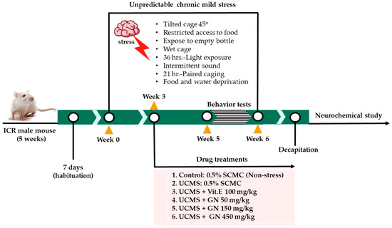 The mice were randomly divided into six groups (n = 12): (1) non-stress control group that received 0.5% sodium carboxymethylcellulose (SCMC) (HiMedia laboratory, Mumbai, India) 1 mg/kg, p.o., and (2) UCMS group, administered with 0.5% SCMC (1 mg/kg, p.o.), (3) UCMS + vitamin E (100 mg/kg, p.o.) (Sigma-Aldrich, St. Louis, MO, USA), (4) UCMS + GN (G. nigrolineata bark resin extract 50 mg/kg, p.o.), (5) UCMS + GN (G. nigrolineata bark resin extract 150 mg/kg, p.o.), and (6) UCMS + GN (G. nigrolineata bark resin extract 450 mg/kg, p.o.). Vehicle and drugs were daily administered at week 4 to week 7 at 8.00 am and 1 h before behavioral testing. One day after finishing behavioral testing, the hippocampus and frontal cortex were immediately collected and kept at −80 °C throughout the experiment. Figure 7 presents a schematic diagram of animal experimental design. According to ARRIVE guidelines 2.0, all animal exclusions were summarized in the report as a flowchart describing attrition in each group. For detailed description, see Figure S51.