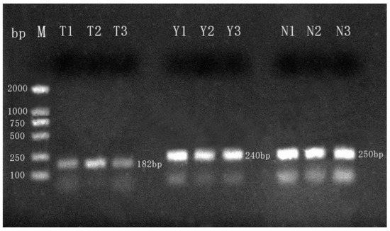 Representative results from agarose gel electrophoresis analysis of PCR products. Lanes T1, T2, T3 = camel Cytb gene amplified camel milk powder DNA template; lanes Y1, Y2, Y3 = ovine Cytb gene amplified ovine milk powder DNA template; lanes N1, N2, N3 = bovine Cytb gene amplified bovine milk powder DNA template; M = molecular weight marker (2000 bp DNA ladder).