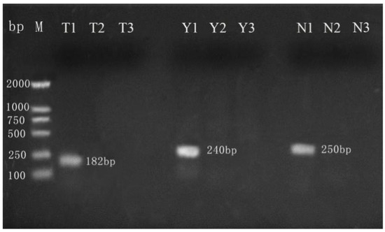 Representative results from agarose gel electrophoresis analysis of PCR validation. Lanes T1, T2, T3 = camel milk powder DNA template amplified with camel, ovine, and bovine Cytb genes, respectively; lanes Y1, Y2, Y3 = ovine milk powder DNA template amplified with camel, ovine, and bovine Cytb genes, respectively; lanes N1, N2, N3 = bovine milk powder DNA template amplified with camel, ovine, and bovine Cytb genes, respectively; M = molecular weight marker (2000 bp DNA ladder).