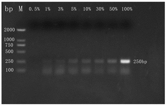 The ordinary PCR assay was optimized for discriminating ovine milk or bovine milk in camel milk powder matrices for detecting adulteration of camel milk powder with ovine or bovine milk powder. The ordinary PCR qualitative detection results showed that the method could clearly detect the incorporated ovine milk (Figure 3) or bovine milk (Figure 4) components in camel milk powder, and the minimum LOD was 1% (wt/wt). In addition, the fluorescence band intensities we obtained showed a trend of being enhanced with an increasing degree of adulteration. Cheng et al. [33] used ordinary PCR to detect the components of bovine milk powder mixed in goat milk powder, and we achieved a comparable sensitivity with our test. The PCR tests used in this screening were therefore demonstrated to be very sensitive, specific, and reproducible.
