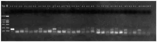 The integrity of the DNA was reflected by amplifying the mitochondrial Cytb gene fragments of interest [27]. Representative agarose gel electrophoresis analysis (Figure 1) showed positive results for the integrity of mitochondrial DNA extracted from camel, ovine, and bovine milk powders, and the resulting bands were clear and consistent, indicating the high integrity of samples with no smearing or diffusion. This indicates that a sufficient enough amount of high-quality DNA was isolated through the method we developed in the present study, which is expected to be useful for species identification. Primer–dimers are present in all amplified sequences. However, any DNA (background or specificity), especially double-stranded DNA, promotes primer–dimer formation even for primers that would not form these products in the absence of DNA [28]. Soares and Deng et al. concluded that, although analysis of PCR amplification products indicated the presence of primer dimers, they did not qualitatively affect the experimental results [29,30].
