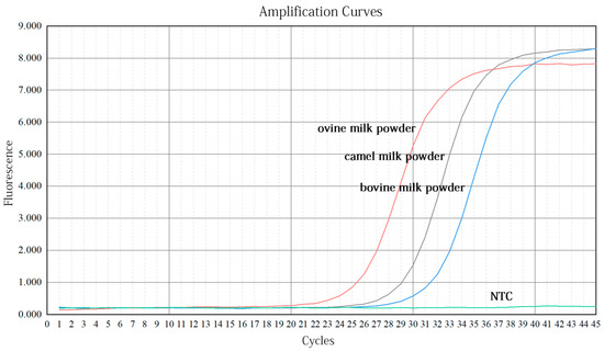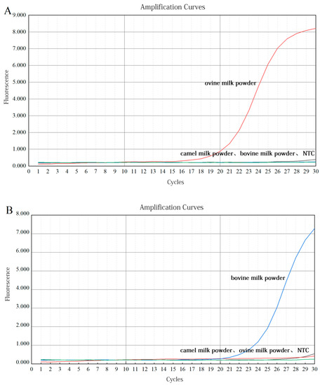 The specificity and versatility of primers in real-time PCR detection methods have a significant impact on the estimation of research results [35]. The reference primers used in the present study were based on ruminants; hence, their generality was assessed by DNA extracted from camel, ovine, and bovine milk powder. As shown in Figure 6, samples from all species showed amplification with Ct values of 28.28, 24.46, and 30.53, indicating good primer versatility. Due to the different copy numbers in tissues of various species, the Ct values of the internal reference primers for amplification are different [36]. The specificity of ovine- and bovine-specific primers was verified using DNA extracted from ovine and bovine milk powder as a positive template, and nontarget species as negative templates. The results in Figure 7A, B show that, within 30 cycles, significant amplification signals were obtained from only ovine and bovine milk powders, and no amplification was observed for camel milk powder. Meanwhile, the NTC did not yield any amplification signals. Thus, this result demonstrates that the reference primers were universal and that the ovine and bovine primers were highly specific to the target species.