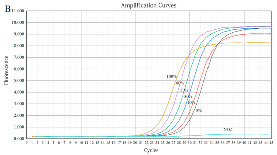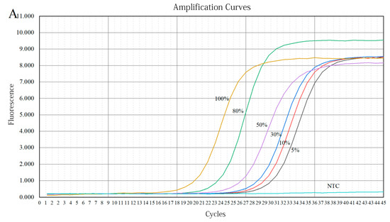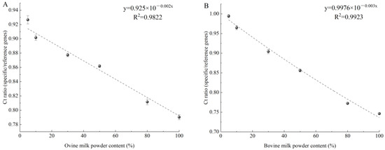Different concentrations (5–100%) of ovine or bovine milk were used to spike camel milk powder samples, which were then subject to detection by specific primers. Figure 8A shows that the amplified Ct values of 5%, 10%, 30%, 50%, 80%, and 100% ovine milk powder were 25.35, 24.41, 23.25, 22.23, 20.75, and 19.42, respectively. As shown in Figure 8B, the amplified Ct values of 5%, 10%, 30%, 50%, 80%, and 100% bovine milk powder were 28.25, 27.78, 26.38, 25.21, 23.58, and 22.83, respectively. All amplified Ct values were less than 30, indicating that the experimental data were reliable. Due to possible differences in the extraction or amplification efficiency between the ovine or bovine species-specific genes and reference genes, the linear relationship between Ct ratio (specific/reference genes) and ovine or bovine milk powder content (ovine or bovine/total milk powder) can reduce the error and calculate ovine or bovine milk content [20]. Figure 9A,B show that the ratio of Ct to ovine or bovine milk powder content exhibits a good exponential response when the ovine or bovine milk powder content is in the range of 5–100%, with a correlation coefficient (R2) of 0.9822 and 0.9923, calibration model y = 0.925 × 10−0.002x and y = 0.9976 × 10−0.003x, respectively. The obtained data for coefficient of determination (R2) greater than 0.98 of the standard curve may be acceptable according to the literature [37,38]. At the same time, it is also shown that the quantitative detection range for ovine or bovine milk components is from 5% to 100% in adulterated camel milk powder.