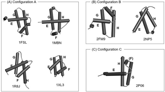 The configurations of helices E, F, G and H. (A) Configuration A: 1FSL, 1MBN, 1R8J and 1XL3 contain the E-to-H helix units with this configuration. (B) Configuration B: a mirror image of configuration A. The 2FM9 and 2NP5 structures contain the units with this configuration. (C) Configuration C: A variant of Configuration A. The 2P06 structure contains the unit with this configuration. The all helices are labeled as E–H.