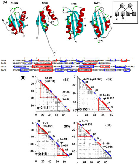 We chose four proteins from this fold. These include the U1A spliceosomal protein (U1A) (PDB: 1URN), procarboxypeptidase A2 (ADA2h) (PDB: 1O6X), ribosomal protein S6 (S6) (PDB: 1RIS), and muscle-type acylphosphatase (mtAcP) (PDB: 1APS). The 3D structures and the sequences with the positions of the secondary structures of these proteins are shown in Figure 6 The segments enclosed by red and blue lines in the sequences denote the positions of α-helices and β-strands, respectively. The ADMs of these proteins are shown in Figure 6B (B1–B4) [27].
