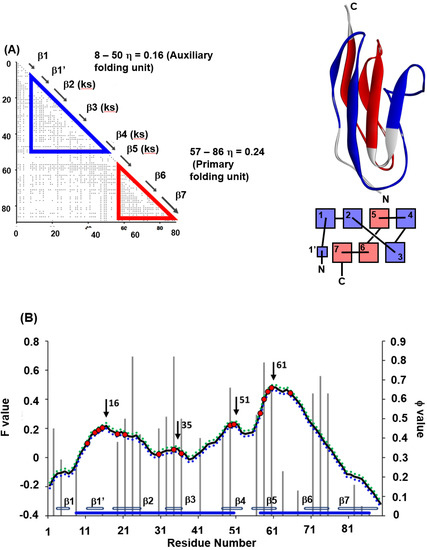 Among the β-sandwich proteins, the folding of titin (PDB code: 1TIT) is well-studied among IgG-like binding proteins [31,32] in particular. We have also treated 1TIT with the ADM and the F-value techniques. Figure 9A,B summarizes the results of ADM and the F-value plot for 1TIT [22]. The φ-value data obtained by Fowler and Clarke [31] are also presented in Figure 9B. The ADMpr of the N-terminus includes β1–β4 and the ADMpr of the C-terminus contains β5–β7; thus, ADMprs cover a major part of the protein, indicating two structural units in the folding. Furthermore, in the φ-value analysis [31], high φ-value areas are observed around β2 and β3 and around β5 and β6, suggesting that the regions around β2 and β3 and around β5 and β6 seem to be centers of folding. Two ADMprs correspond to these two regions. In Figure 9A, the positions of key strands are also indicated with the symbol “ks”. Our study revealed that two ADMprs contain two key strands, i.e., β2 and β3 in the N-terminal ADMpr and β5 and β6 in the C-terminal ADMpr, respectively. It was also confirmed that the CHRs include the key residues. Furthermore, the peaks of the F-value plot are near the key strands.