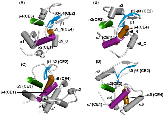 The E-to-H helix unit may be treated as an additional supersecondary structure. A residue pattern or motif in each of the E, G or H helices is a typical hydrophobic residue pattern in α-helices, and the combination of these residue patterns that would stabilize the E-to-H helix structure as shown in Figure 5A,B presents the packing of CHRs in 1FSL and 1R8J). The important point is that such a structural unit should form a stable structural unit as a region predicted by ADM.