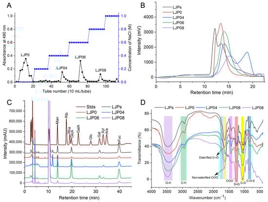 Preparation and physicochemical characteristics of LJPs and the purified fractions. Stepwise elution curve of LJPs (A), HPGPC profiles (B), monosaccharide compositions (C), and FT-IR spectra (D).