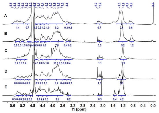 The 1H NMR spectra of LJPs, LJP0, LJP04, LJP06, and LJP08 are shown in Figure 2. In their 1H NMR spectra, the signals at 5.0–5.5 ppm and 4.4–4.7 ppm could be attributed to the anomeric protons of α and β configurations of sugar residues, respectively []. The broad and overlapping signals in the region of 3.3–4.3 ppm could be assigned to the ring protons of the sugar residues. The signals at 2.0–2.2 ppm were from the methyl protons of acetyl groups in the polysaccharides, indicating that some of monosaccharide residues were O-acetylated []. The signals at 1.2–1.3 ppm could be readily assigned to the CH3 protons of Fuc residues []. According to the spectra of LJP04, LJP06, and LJP08, few signals of impurities were found, indicating high purities of these purified fractions.