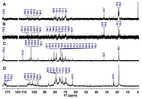 The 13C NMR spectra of LJPs, LJP0, LJP04, and LJP06 are shown in Figure 3. Signals of LJPs and LJP0 were very weak because of their high Mw. According to data from previous reports, the signals at 176−179 ppm could be attributed to the carbons of carbonyl groups in GlcA and acetyl groups [,,], and the signals at about 96–111 ppm could be attributed to the anomeric carbons of sugar residues []. The chemical shifts at 70−88 ppm showing broad and overlapping peaks could be assigned to other carbons of glycosidic rings. The chemical shifts at δ 63 ppm may be due to the unsubstituted C-6 signals of Gal and Man. The up-field signals in the vicinity of 32/24 and 18 ppm could be attributable to the methyl carbons of acetyl group and Fuc residues, respectively []. These NMR signals of the purified fractions are consistent with the results of their chemical compositions. The detailed structures of these purified fractions need to be elucidated by their 2D NMR spectra in the future.