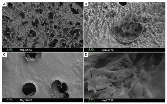 SEM images of the purified fractions LJP0 (A), LJP04 (B), LJP06 (C), and LJP08 (D). The magnification is 2 kX, and the scale bar is 4 μm.
