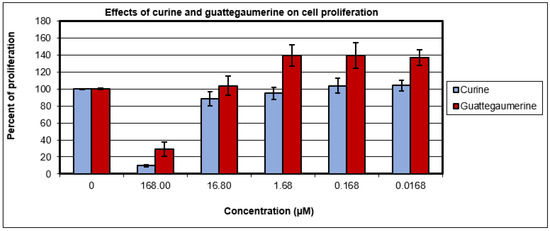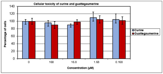 In reference to activities previously described in the literature for these two molecules [13,14,19], the cellular toxicity of curine and guattegaumerine was initially tested on confluent rat hepatocarcinoma cells (HTC-R) at concentrations ranging from 0.168 to 168 µM. The cells were exposed to the drug for 24 h. The survival of cells was measured by staining with crystal violet and compared with that of untreated cells. The percentage of living cells after exposure to drugs remained identical to that in the control (Figure 2). Moreover, no significant toxicity was observed for curine and guattegaumerine, even after 48 h of exposure.