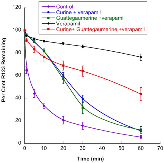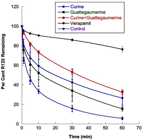 Effects of curine and guattegaumerine on the inhibition of rhodamine 123 efflux by verapamil. HTC-R cells were grown to confluence in DMEM and rhodamine accumulated for 90 min at 37 °C. After washing the cells, the efflux of rhodamine was initiated at 37 °C by the addition of PBS (control) or PBS containing verapamil, verapamil and curine, or verapamil and guattegaumerine at 100 μM each. For the time indicated in abscissa, the amount of rhodamine output from cells was measured by fluorescence. The results are expressed as a percentage of rhodamine 123 remaining in the cells. They are representative of at least two independent experiments and show the mean ± SD of triplicate plates.