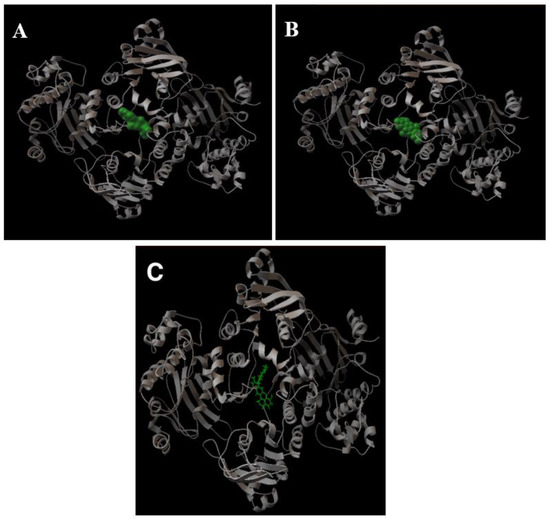 A 3D representation of the binding of verapamil, curine, and guattegaumerine on the LmrA protein. The pictures presented in the figure are a graphical output of AutoDock 4.2. All of the representations of LmrA (ribbon in gray) are in the same orientation. (A) Verapamil on LmrA; (B) curine on LmrA; (C) guattegaumerine on LmrA. Verapamil and curine are represented in terms of their volume (green) and guattegaumerine is shown in a stick representation.