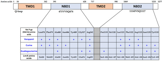Diagram of rat Mdr1b and LmrA amino acids of the NDB domains involved in binding with drugs. The top of the figure shows a simple diagram of the protein with 1277 amino acids with the positions occupied by the two transmembrane domains (TMDs) and the two nucleotide-binding domains (NBD). The amino acids involved in drug binding deduced from the docking analysis of rat P-gp (Mdrlb) and LmrA are shown in the table. Amino acid sequences of rat Mdr1b and of Lactococcus lactis LmrA were obtained from the Swiss Prot database (access code: P43245) and UniProtKB/Swiss-Prot database (access code: P97046), respectively.