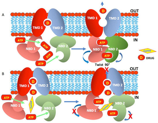 A hypothetical model that explains how curine affects the efflux activity of ABCB1. (A) displays a schematical representation of the ABCB1 membrane protein in the process of the efflux drug. (A) shows the transition from an inactive state to an active state of the efflux pump. The exclusion of a drug (D) through the channel, which is formed by the interaction of the two transmembrane domains (TMD1 and 2), occurs following the hydrolysis of ATP after its binding to the NBD1 and 2 sites. The energy released by this hydrolysis promotes a 90° rotation of the NBDs, thus allowing the opening of the channel and the efflux of the drug (D). (B) shows the inhibition of the efflux of the drug (D) following the binding of curine to the NBDs, thus preventing their rotation and the opening of the pump channel.
