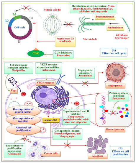 General mechanistic insight of anticancer drugs derived from plants. M, G1, G2, and S represent distinct phases of a cell cycle characteristic to specified functions or intervals; where M phase: mitosis cell division; S phase: DNA synthesis; G1 (gap 1) phase: gap between completion of M phase and initiation of S phase; and G2 (gap 2) phase: gap between completion of S phase and initiation of M phase.