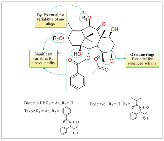 The anticancer movement of taxanes is comparable to the activity of vinca alkaloids and is related to their impact on the microtubules, which are composed of heterodimers of α-tubulin and β-tubulin. Taxanes constitute the microtubule-interacting and microtubule-stabilizing agents that potentiate the microtubule polymerization [12] (Figure 2). The approach of microtubule polymerization and depolymerization are fundamental for mitotic cell division. Taxanes, rather than vinca alkaloids, bind to the inside of the microtubules with high affinity. An excessive concentration of taxanes causes microtubule polymerization, whereas the Catharanthus alkaloids repress it. Taxanes are one of the most effective drug types utilized for the remedy of breast and ovarian cancers and are also utilized to treat squamous cell carcinoma of the neck and head [54].