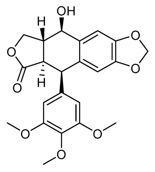 Podophyllotoxin (Figure 6) is a toxin lignan separated from the Berberidaceae family (i.e., Podophyllum). The gum, which is called podophyllin, is derived from the Podophyllum peltatum species found in North America. Podophyllotoxin is derived from Podophyllum emodi gum which is commonly found in Asia [72]. Podophyllum peltatum plant life also incorporates ɑ-peltatin, β-peltatin and their corresponding glycosides in conjunction with podophyllotoxin- ɑ -D-glucoside. Podophyllotoxin and its derivatives boast substantial effects as organic antineoplastic drugs and antiviral agents. Podophyllotoxin and its glycosides display a solid cytostatic impact because they disturb the organization of the karyokinetic shaft.