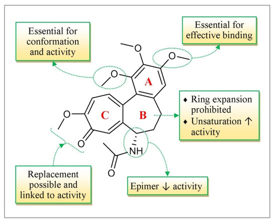 Colchicine is an alkaloid isolated from the plants of the Colchicum genus (e.g., the harvest time crocus, Colchicum autumnale, also known as “meadow saffron”) and utilized in the treatment of gout and familial Mediterranean fever (FMF) [89,90]. Inquiry has uncovered that colchicine and its analogs also appear to possess anti-inflammatory, antitumor, and anti-HIV activities [91,92]. The SAR of colchicine is presented in Figure 8.