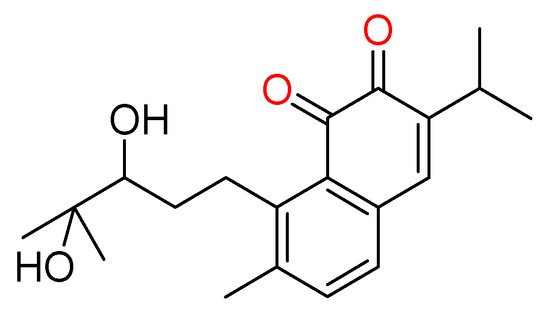 Salvicine (Figure 11) may be an altered diterpenoquinone subsidiary confined from the Chinese herb Salvia pronitis Hance (Labiatae). This compound was chemically synthesized by Sheng et al. in 1999 and it has exhibited strong inhibitory action on a wide array of human tumor cells in vitro and in mice bearing human tumor xenografts [109]. Salvicine and its subordinates are non-intercalative topoisomerase II poisons that work against solid tumor [110].