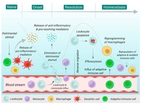 During the onset of inflammation, the detrimental stimuli are detected by resident cells and the inflammatory cascade will be initiated via the active release of soluble pro-inflammatory mediators. This is followed by delayed monocyte emigration and the upregulation of adhesion molecules by circulating leucocytes and endothelial cells, leading to an influx of neutrophils and eosinophils, as well as macrophages from the bloodstream into the affected site. The leucocytes are responsible for the elimination of microorganisms and tissue debris via phagocytosis. The resolution phase is characterized by the removal of inflammatory infiltrate where the production, function, and signaling of pro-inflammatory cytokines are limited. The process is followed by neutrophil apoptosis and monocytes efferocytosis, which clears dysfunctional cells from the site of injury. The production of pro-resolving mediators is induced via the reprogramming of macrophages from classically to alternatively activated cells. At the same time, non-apoptotic cells leave the site of injury through reverse migration or lymphatic migration. Lastly, adaptive and resident immune cells repopulate the tissue, thereby resolving the acute inflammatory processes and returning to tissue homeostasis [26,27,31]. The summary of the inflammatory processes in different body organs is shown in Table 1.