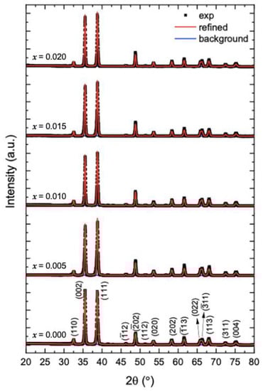The XRD patterns of undoped and Mg-doped CuO NPs (Cu1−xMgxO NPs) are shown in Figure 1. The patterns of the undoped CuO NPs show that all the peaks reflect the planes of monoclinic CuO, which are (110), (002), (111), (12), (02), (112), (020), (202), (13), (022), (11), (113), (311), and (004). Given that no other secondary phases, relating to impurities or the Cu2O phase are found. Moreover, when CuO is doped with magnesium, the diffraction peaks of CuO NPs are not altered. To assure this observation, the XRD patterns of all the samples are refined via the MAUD program (Figure 1). The refinements checked the possible formation of MgO as a secondary phase. However, all the samples are well fitted to the pure CuO phase, without any presence of MgO. The obtained patterns for undoped and Mg-doped CuO NPs are similar to the previously reported literature [,,]. Lv et al. [] synthesized Mg2+, Zn2+, and Ce4+-doped CuO nanoparticles by the hydrothermal method. They obtained a pure phase of CuO in the XRD patterns with a doping concentration of less than 7%, indicating the total incorporation of the dopants into the lattice, without the formation of secondary phases. However, beyond 7%, at 10% doping percentage, MgO, ZnO, and CeO2 phases were formed in the CuO lattice. This further aligns with the present study, as all the prepared Mg-doped CuO NPs formed pure CuO phase, as the doping percentage ranged between 0.5% (x = 0.005) to 2% (x = 0.020).