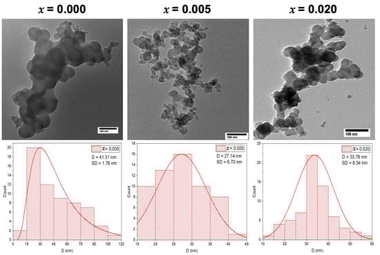 The morphology and size of the undoped and Mg-doped CuO NPs (Cu1−xMgxO NPs) were determined using the Transmission Electron Microscope (TEM) technique. The TEM images demonstrate spherical NPs for the three selected samples, as shown in Figure 2. The Mg doping led to some noticeable changes in the NP morphology. The TEM images showed agglomeration for the undoped CuO NPs (x = 0.000), whereas, with the doping of Mg at concentrations of x = 0.005 and x = 0.020, the agglomeration of the doped CuO NPs is reduced, showing more uniform shapes, as depicted in Figure 2. The average particle sizes of the synthesized samples are determined from the particle size distribution which is extracted from the TEM images, using ImageJ software. This distribution is fitted by a Gaussian function, from which the average particle sizes are determined along with the standard deviation (SD), as shown in Figure 2. The obtained average particle size for undoped CuO NPs is 41.31 ± 1.76 nm. Upon Mg doping with x = 0.005, the particle size decreased to 27.14 ± 6.70 nm and increased slightly to 33.78 ± 8.54 nm with x = 0.020. These alterations in the average grain sizes with the increase in the concentration of Mg-doping may be attributed to the dissimilarity in Pauling electronegativity that affected the growth rate of Mg-doped CuO nanoparticles. The host Cu ions have a Pauling electronegativity of 1.9, which is higher than that of the doped Mg ions (1.31). This dissimilarity proves the decrease in the growth rate at low concentrations of Mg-doped CuO NPs []. However, at higher concentrations, the Mg-doped ions may incorporate into the lattice, not only filling substitutional sites but also occupying interstitial sites, that yield larger grains, as seen in the sample with x = 0.020.