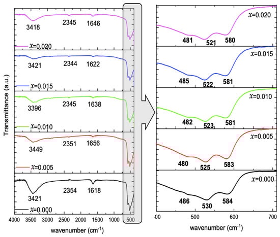 The FTIR spectra, represented in Figure 4, of the undoped and Mg-doped CuO NPs, demonstrated different vibrational bands. A broad absorption band ranged between 3200 and 3600 cm−1. The adsorbed water is present in all spectra. A small peak is detected at 2344–2354 c, and a peak centered around 1618–1656 cm−1 is observed. The main peaks, ranging between 700–400 cm−1, are displayed in Figure 4. Three peaks are detected, which are centered around 480–486, 521–530, and 580–584 cm−1.