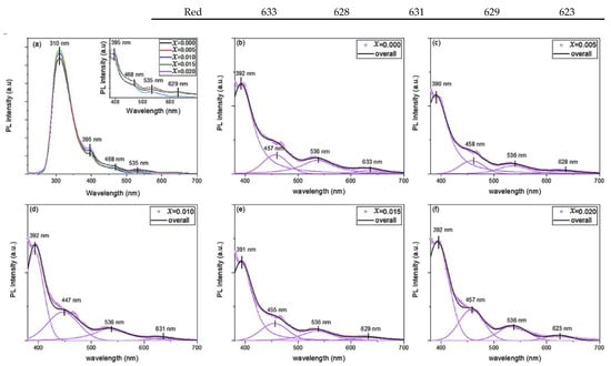 Figure 5a shows the room temperature photoluminescence (PL) emission spectra for Cu1−xMgxO NPs with an excitation wavelength of 200 nm. A prominent UV peak appeared at 310 ± 1 nm in all samples, with the highest intensity, as compared to other peaks. Furthermore, the visible emissions in the PL spectra are deconvoluted by four Voigt functions to elucidate the origin of these emissions. The position of the fitted peaks is listed in Table 1, along with the position of the UV peak. It is noticed that the increase in the concentration of the Mg doping in CuO NPs did not affect the position of the peaks, however, it affects their intensity. This is similar to the reported literature, where the doping concentration does not affect the position of the peaks in the visible part of the PL spectra [,,,]. The deconvolution of the PL spectra of Cu1−xMgxO NPs yielded violet (391 ± 1 nm), blue (452 ± 5.5 nm), green (536 nm), and orange-red (628 ± 5 nm) emission peaks.