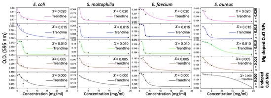 All isolates showed sensitivity to the undoped CuO NP (x = 0.000). E. faecium was the most sensitive. It showed a sensitivity against the lowest NP concentration (0.1875 mg/mL). The other three bacteria showed a sensitivity against an NP concentration of 1.5 mg/mL. Sensitivity was considered positive for ZOI diameters > 7 mm []. All the bacterial isolates were sensitive to the Mg-doped CuO NP with x = 0.005. E. coli and S. maltophilia showed a sensitivity to the NP at a concentration of 0.75 mg/mL. E. faecium and S. aureus showed sensitivity against a concentration of 1.5 mg/mL. All investigated bacteria showed sensitivity to Mg-doped NPs with x = 0.010. S. aureus showed susceptibility against a concentration of 0.75 mg/mL. E. faecium showed a sensitivity against a concentration of 1.5 mg/mL. S. aureus, E. coli, and S. maltophilia exhibited a sensitivity at the highest concentration (3 mg/mL). All isolates were sensitive to the Mg-doped CuO NP with x = 0.015. E. faecium was the most sensitive. It showed a sensitivity starting from the lowest concentration (0.1875 mg/mL). S. aureus, E. coli, and S. maltophilia were sensitive at concentrations starting from 0.375 mg/mL. All isolates were sensitive at the highest NP concentration (3 mg/mL). For Mg-doped CuO NP with x = 0.020, all bacteria exhibited sensitivity only at the highest NP concentration (3 mg/mL). The agar well diffusion results of the undoped and Mg-doped CuO NPs are shown in Table 3 and Figure A4 (Appendix A). All results were significant with a p-value ˂ 0.05 shown in Table A1 (Appendix A).