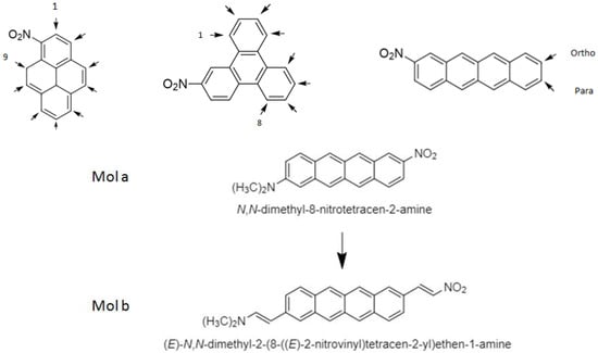 We also study some push–pull molecules when interacting with SWCNTs. The push–pull molecules considered in this work are shown on Figure 1. They consist of the pure polycyclic aromatic hydrocarbons tetracene, isochrysene, and pyrene and they all contain a conjugated bridge with delocalized π electrons [,,]. We study the effects of substituting the PAHs at different positions through donors []: NH2, N2H3, N(CH3)2, OH, OCH3, and the acceptor group NO2 [].
