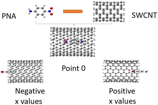 Subsequently, we considered the effects of intercalation of derivatives of a single PAH molecule inside carbon nanotubes. Initially, we constructed a (9,9) armchair nanotube with a diameter of 12.21 nm and a length of 19.69 nm as shown, e.g., in Figure 2 and Figure 3 Dangling bonds at the ends were saturated with hydrogen atoms. The initial structure of this chair-type SWCNT was optimized using the B3LYP density functional [] combined with the 6-31g(d,p) basis set []. We investigated the effect of the position of the guest molecule, paranitroaniline (PNA), inside the nanotube by performing single-point calculations using the CAM-B3LYP functional together with the GD3 dispersion correction [,] and using the 6-31g(d,p) basis set. Various NLO parameters, including the static first hyperpolarizability, the dipole moment, and the HOMO–LUMO energy gap, were calculated for different positions of the guest molecule inside the nanotube by translating the former along the x-axis (parallel to the tube) with a step length of 2 Å relative to the initial position (denoted position 0, cf., Figure 2).