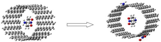 Finally, we modified the host system, i.e., to the armchair-type nanotube, we attached an NH3 donor on one side and an NO2 acceptor group on the other side, cf., Figure 3. At first, the structure of the isolated host was optimized using B3LYP/6-31g(d,p), after which the push–pull molecule PNA was inserted in the center of the tube and calculations were performed to check the effect of these substitutions on the hyperpolarizabilities and on the total dipole moment.