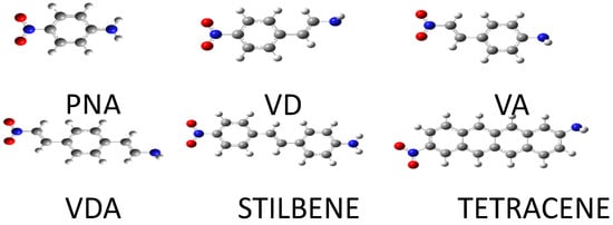 After that, we examined the effect of the size of the guest molecule on the intramolecular charge transfer of the system. For that purpose, we considered different push–pull molecules inserted inside the chair-like nanotube. As guest molecules, we considered PNA, VD, VA, VDA, stilbene, and tetracene, all shown in Figure 4. For each system, the static hyperpolarizabilities and the dipole moment were calculated