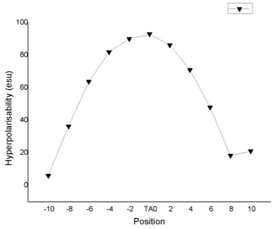Evolution of hyperpolarizability (10−30 esu) of CNT-PNA as a function of the PNA position inside the CNT and as obtained with the CAM-B3LYP/6-31g(d,p) method.