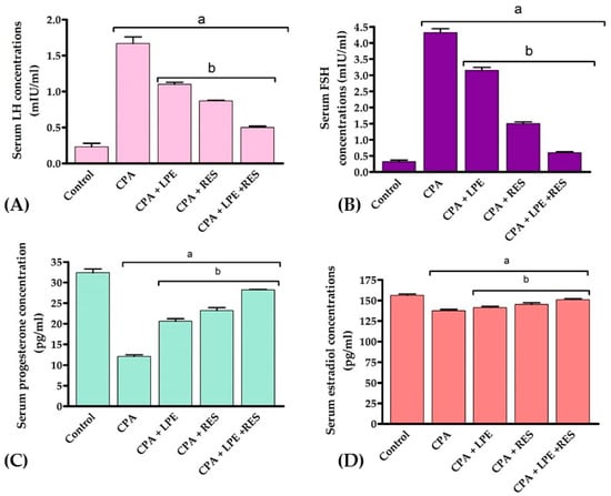 Effects of LPE and/or RES on the serum hormonal markers of cyclophosphamide-treated rats. (A) LH concentration, (B) FSH concentration, (C) Progesterone concentration, (D) Estradiol concentration. Data expressed as mean ± SEM, a p < 0.05 versus the control group; b p < 0.05 versus a CPA group, (n = 7). CPA: Cyclophosphamide, LPE: Lemon peel extract, RES: resveratrol.