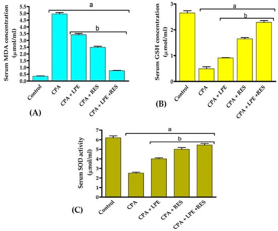 Figure 2 reveals that the levels of MDA were significantly upregulated (p < 0.05) with a large drop in GSH level and SOD activity after CPA treatment contrasted with a negative group. Treatments with LPE, RES, or LPE + RES significantly downregulated (p < 0.05) the MDA levels while significantly elevating the GSH level and SOD activity, compared with the CPA group. These results showed that co-treatment of both LPE with RES in CPA-treated rats ameliorated the oxidative stress caused by CPA treatment.