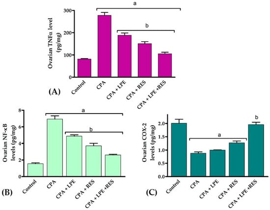 Effects of LPE and/or RES on ovarian tissue inflammation markers in cyclophosphamide-treated rats. (A) TNF-α levels, (B) NF-κB and (C) COX-2 levels. Data expressed as mean ± SEM. a p < 0.05 versus control group; b p < 0.05 versus a CPA group, (n = 7). CPA: Cyclophosphamide, LPE: Lemon peel extract, RES: resveratrol.