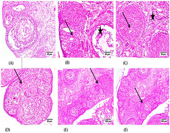 Microscopic examination of ovaries from the control group (Figure 4A) revealed normal histology of the ovary that showed numerous corpora lutea with multiple growing follicles in different stages. Examination of the CPA group (Figure 4B,C) revealed interstitial cell hyperplasia of variably sized clusters of pale-staining cells that were interspersed among several follicles in various stages of development, including large atretic follicles, mature corpora lutea, and congested blood vessels. Large polyhedral cells with pale eosinophilic granular cytoplasm and central nuclei characterized the hyperplastic interstitial cells. The corpus luteum showed degenerated and necrotic cells in the CPA group in some instances. The section of ovaries in the CPA with either LPE or RES groups (Figure 4D,E) showed a slight improvement in the corpus luteum. Furthermore, the CYP group treated with the LPE + RES (Figure 4F) displayed normal follicles in different stages. Our histological examination revealed that co-treatment of both LPE with RES in CPA-treated rats restored the architecture of ovarian tissues nearly to the control group.