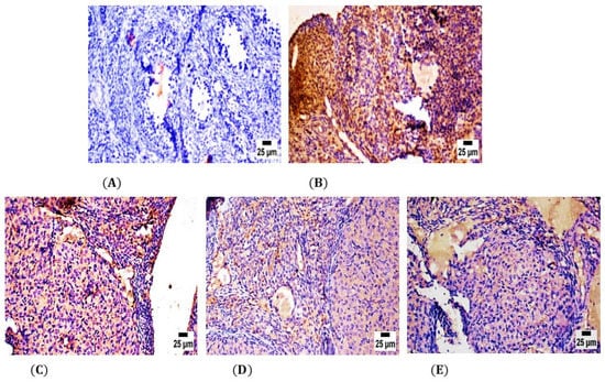In the control group, the ovary tissue showed negative reactivity (0) for TNF-α polyclonal antibodies in Graafian follicles and luteum (Figure 5A); however, in the CPA group, the ovaries showed high expression of TNF-α polyclonal antibodies in Graafian follicles and luteum contrasted to the self-control group at p ≤ 0.05 (Figure 5B). Specifically, both the ovaries of LPE & RES groups showed moderate to mild cytoplasmic reactivity (++) for TNF-α polyclonal antibodies in Graafian follicles and luteum with a significant decrease in optical density % of TNF-α polyclonal antibodies in comparison with the CPA group at p ≤ 0.05 (Figure 5C,D). On the other hand, ovaries in the LPE + RES group showed improvement in weak cytoplasmic reactivity (+) for TNF-α polyclonal antibodies in Graafian follicles and luteum (Figure 5E) with significant inhibition in optical density % of TNF-α polyclonal antibodies compared with the CPA group. This immunohistochemical analysis affirmed the anti-inflammatory effects of co-treatment of both LPE and RES in CPA-treated rats.